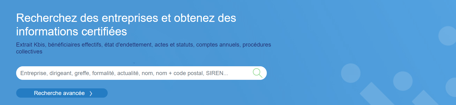 Sur le site Infogreffe.com, qui est le répertoire de toutes les entreprises existantes en France, vous pouvez effectuer une recherche avancée. Ce mode de recherche vous permettra de retrouver les informations de votre entreprise grâce à son nom et au code postal de son activité.