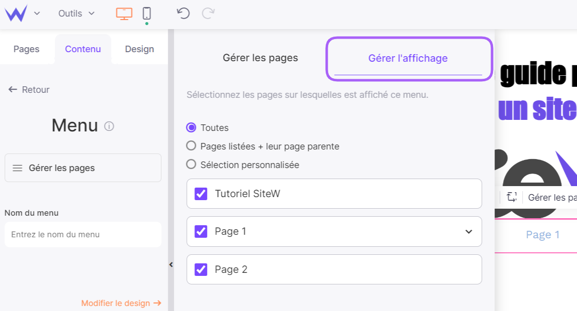 En cliquant sur Gérer les pages, vous accèderez à un panneau qui permet la configuration du menu et son affichage.